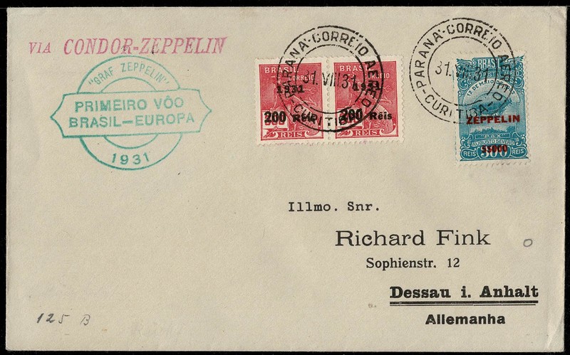 Ano 1931 – Sieger 125A – Envelope circulado de Curitiba para a Alemanha, com todos os carimbos alusivos ao Vôo – Selo Z10 + par vovó. Carimbo do vôo na cor verde. Ótima qualidade