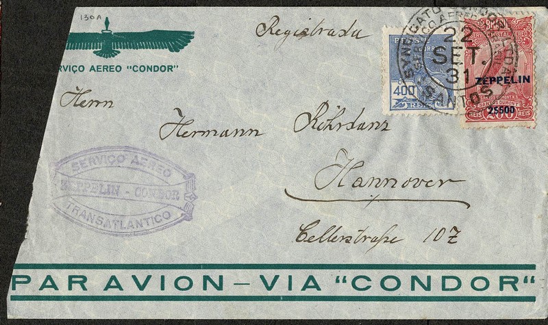 Zeppelin – Sieger 130A – Ano 1931 – Circulado de Santos para a Alemanha, com todos os carimbos alusivos ao Vôo. Selo Z10 vovó. Lateral esquerda bem refilada.