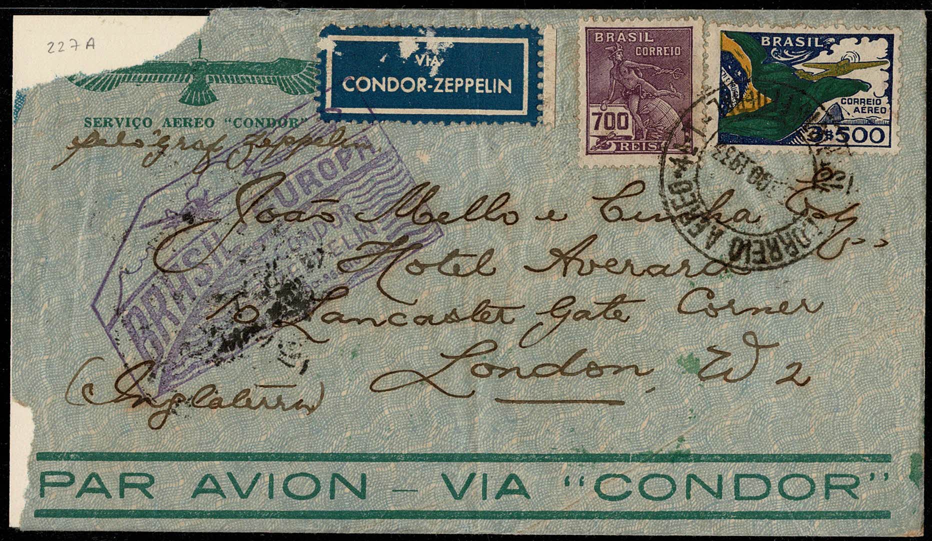 ZEPPELIN – Sieger 227A – Ano 1933 – Envelope danificado na parte superior, circulado do Rio de Janeiro para a Inglaterra, com carimbo de chegada na Alemanha todos os carimbos alusivos ao Voo. Selo Aéreo vovó. Pede-se verificar.