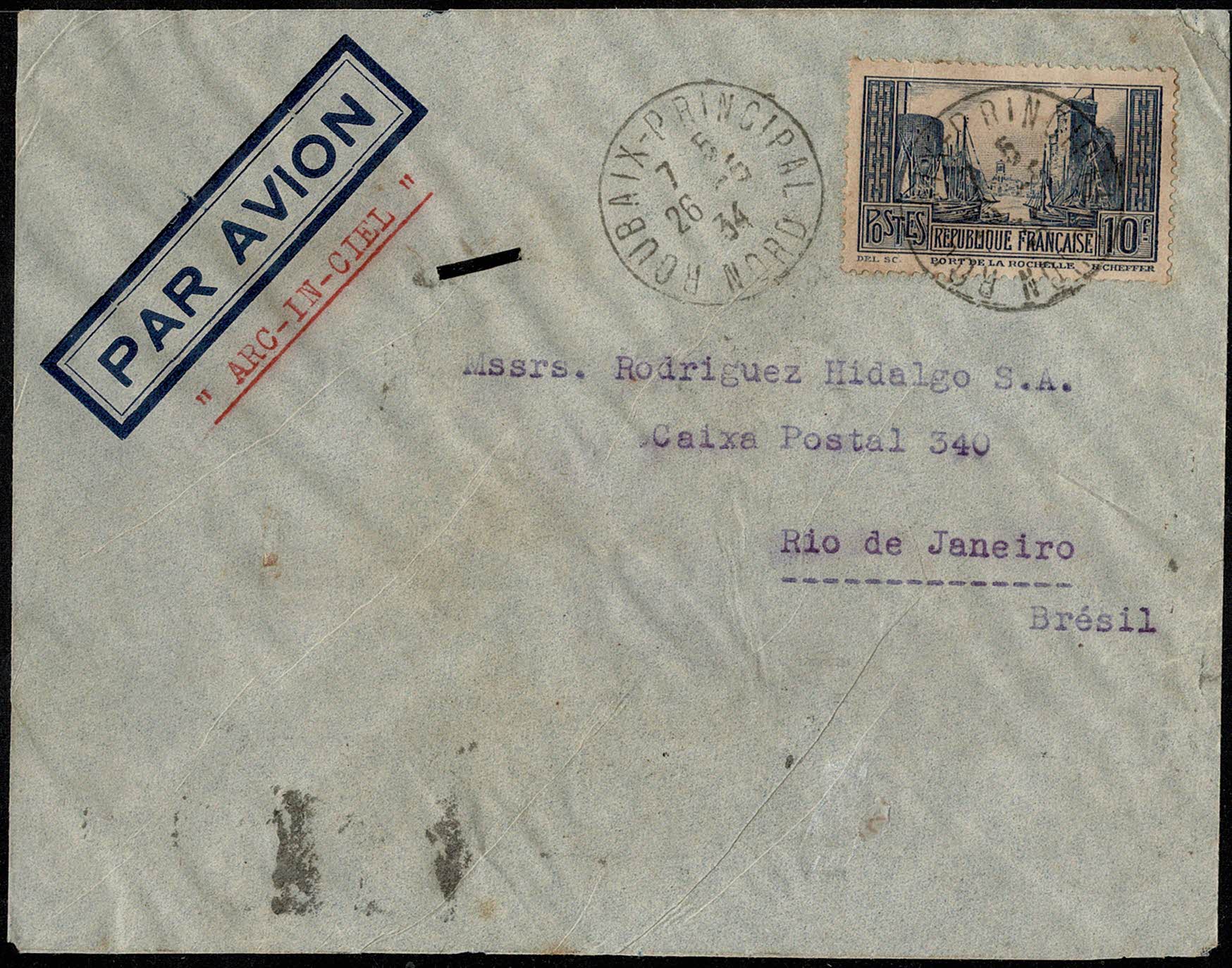 OUTROS/DIVERSOS – MERMOZ – Ano 1934 – Envelope circulado da França para o Rio de Janeiro, com chegada. Voo realizado com o avião Arc-em-Ciel e pelo piloto Jean de Mermoz.