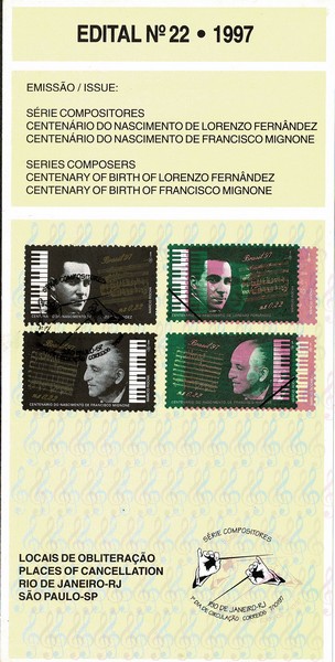 Ano 1997 – Nº 22 – Compositores – Selado – Variedade no edital : Bem grande deslocamento horizontal das cores