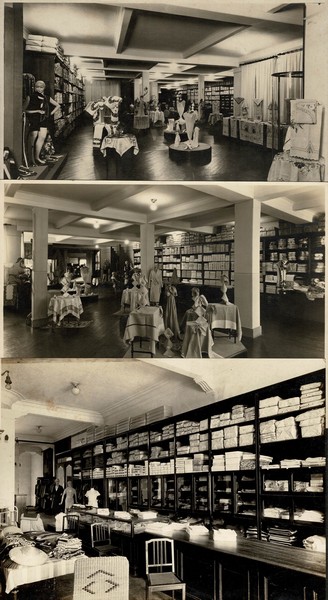 FOTOS – 3 diferentes na medida 23x17cm, mostrando interior de loja : Atelier Astro (SP) secção de Cama e Mesa/Roupas Brancas e Santos (Fotografo Marques Pereira) Provável anos 30.