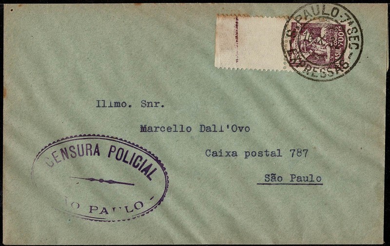 Data 16.9.32 – Envelope censurado, ref. 1.4.10.0 (estudo de J. Meiffert) na cor violeta, circulado dentro de São Paulo e porteado com selo de 700 Réis em franquia isolada.