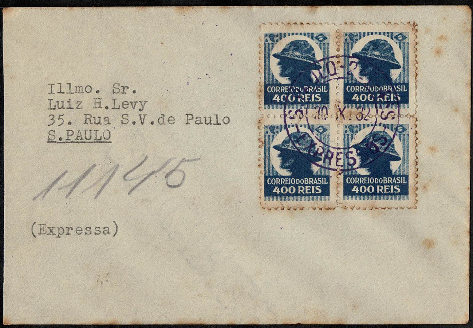 Data 30.10.32 – Envelope expresso circulado dentro de São Paulo e porteado com quadra facial 400 Réis. Pontos de ferrugem.