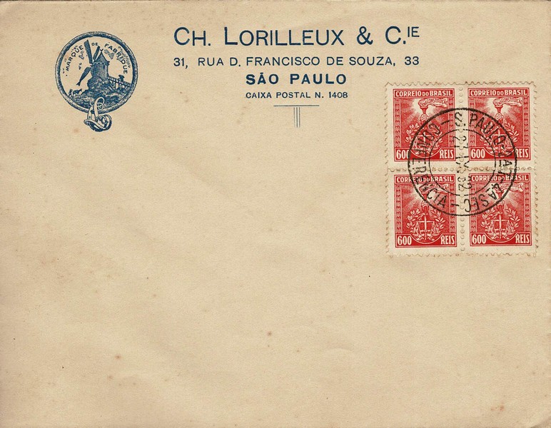 ENVELOPES – Conjunto com 9, todos sem circular e timbrados da empresa CH. Lorilleux & Cie (SP) Todos também com a mesma data: 27.9.32 e assim distribuído pelos faciais: 100Rs (quadra) 200Rs (quadra) 300Rs (isolado) 400Rs (quadra) 500Rs (quadra) 600Rs (isolado e quadra) 700Rs (quadra) e 1.000 Réis (isolado) Alguns pontos de óxido. Valor dos selos usados: 277 UF.