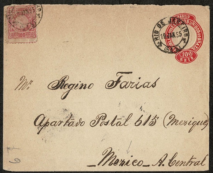 Ano 1895 – DESTINO MÉXICO – Inteiro tipo EN (100Rs) selo Cabecinha, circulado do Rio de Janeiro, com carimbo de transito chegada.