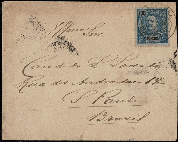 Ano 1898 – ORIGEM FUNCHAL – Envelope circulado para São Paulo, com carimbo de transito em Santos, Ambulante e chegada. Selo Carlos 1º. 100Rs.
