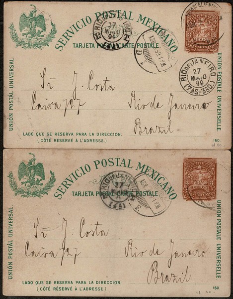Ano 1899 – ORIGEM MÉXICO – 2 inteiros postais iguais ( 3 centavos) ambos vindo para o Rio de Janeiro, com carimbo de transito chegada.