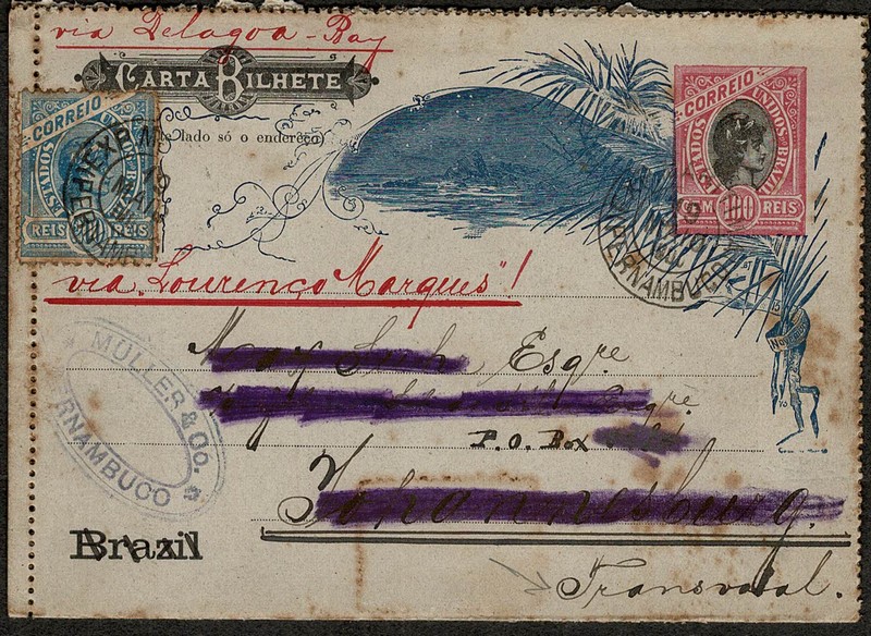Ano 1900 – DESTINO TRANSVAAL – Inteiro Postal CB56e (100Rs) selo madrugada 200Rs azul, circulado de Pernambuco. Indicação via Lourenço Marques. Basicamente todo o destinatário com tinta roxa por cima. Pontos de ferrugem