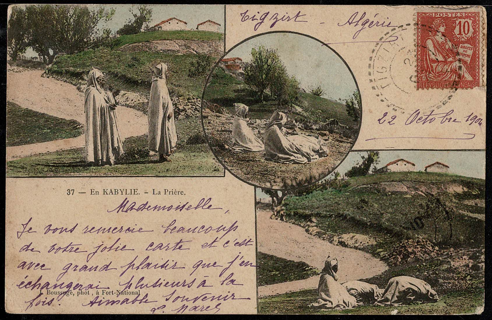 Ano 1904 – ORIGEM ALGÉRIA – Cartão Postal colorido, tipo 3 vistas, circulado para Coronel Pacheco (MG) com duplo carimbo de chegada no Rio de Janeiro. Selo Francês porteando a peça ..