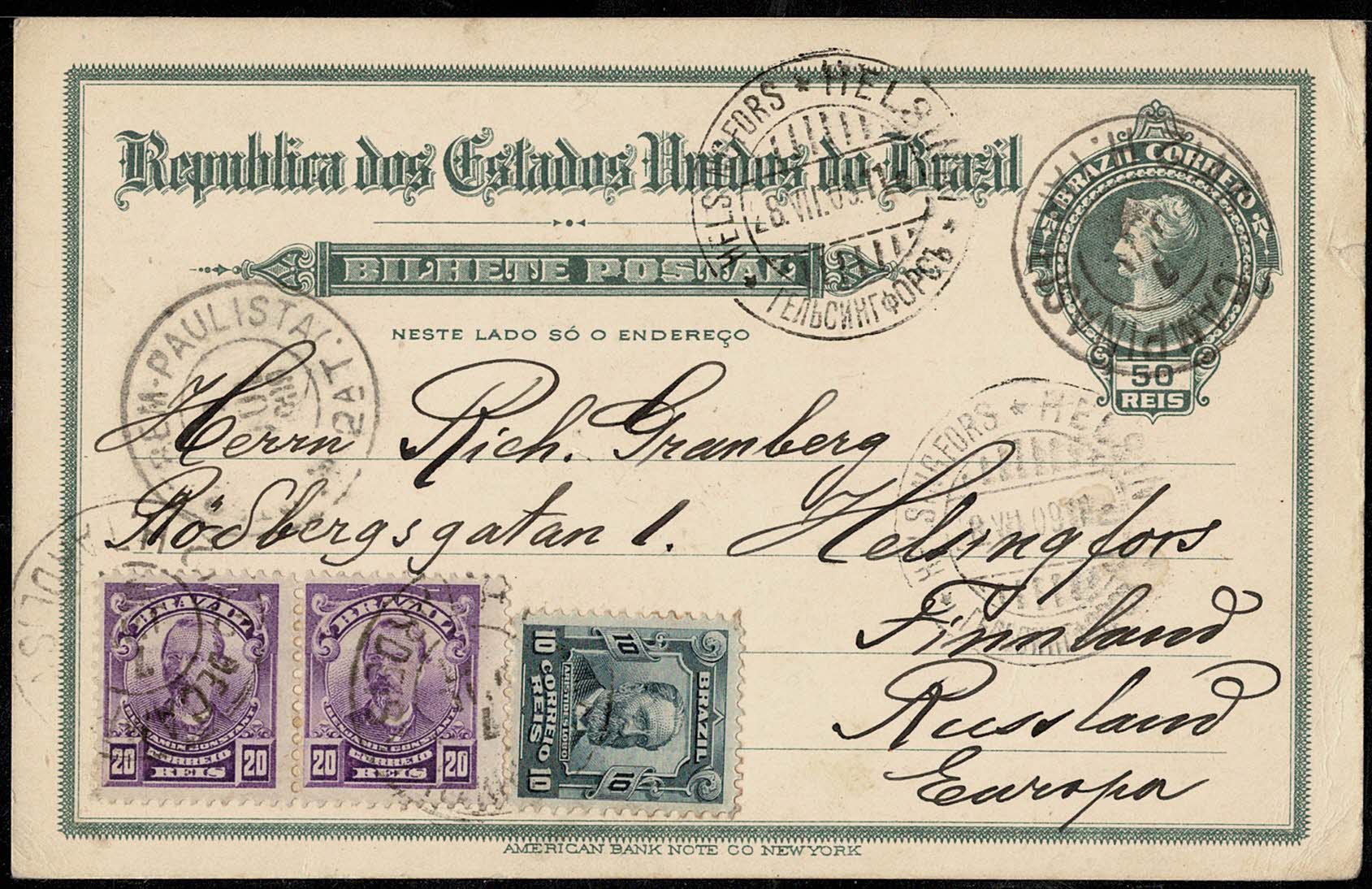 Ano 1909 – DESTINO FINLANDIA (Sob Dominio Russo) – Inteiro Postal BP68 selos Próceres, circulado de Campinas, com chegada.