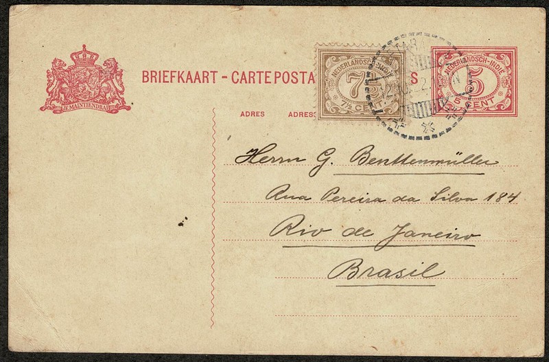 Ano 1922 – PROCEDÊNCIA INDIA HOLANDESA – Inteiro Postal selo adicional, circulado para o Rio de Janeiro, sem chegada.