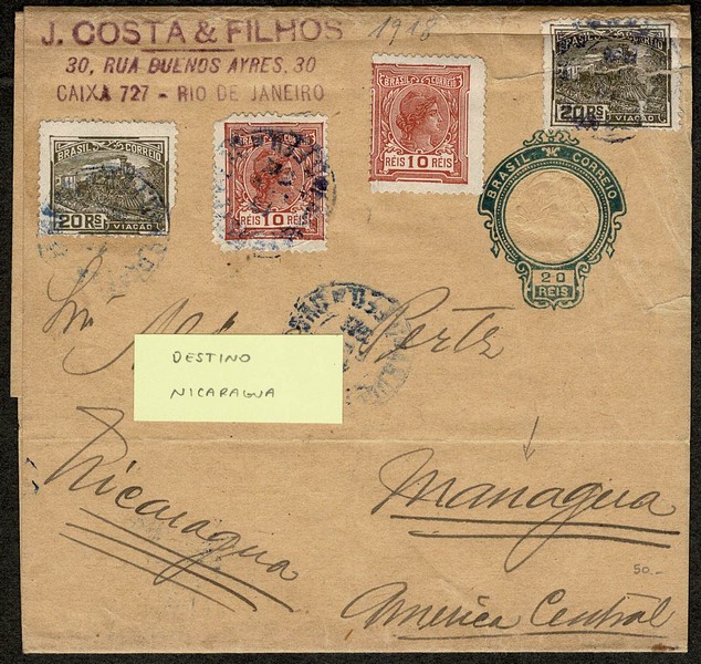 Ano 192? – DESTINO NICARAGUA – Cinta 20Rs 4 selos vovó (1 sem carimbo) circulado do Rio de Janeiro. 80Rs de porte. Correto ?