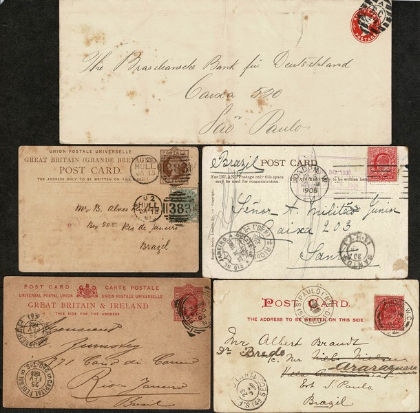 ORIGEM INGLATERRA – Lote com 5 peças enviadas ao Brasil, sendo 3 com chegada. Século 19 à ano 1905.