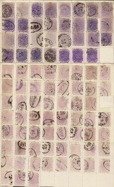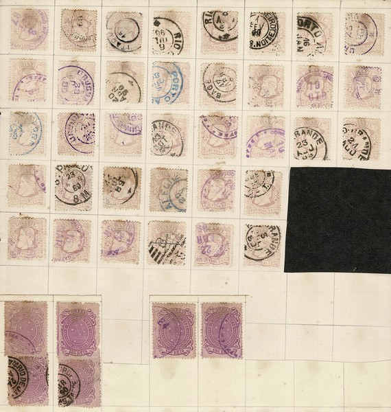 ◉ CASA DA MOEDA/CRUZEIROS – Antigas folhas de caderno artesanal, contendo 136 selos usados e de 4 tipos diferentes: Nº 57 (200Rs Rosa x 36 selos, sendo boa parte com carimbo do RS) e 3 faciais da série Cruzeiro: 100Rs nº 72 (7 selos) 200Rs nº 73 (31 selos) e 100Rs tipografado nº 78 (59 selos) Afixados com antiga cola (saem na agua ?) Vendidos com esta ressalva. Garimpo para defeitos de chapa e carimbos