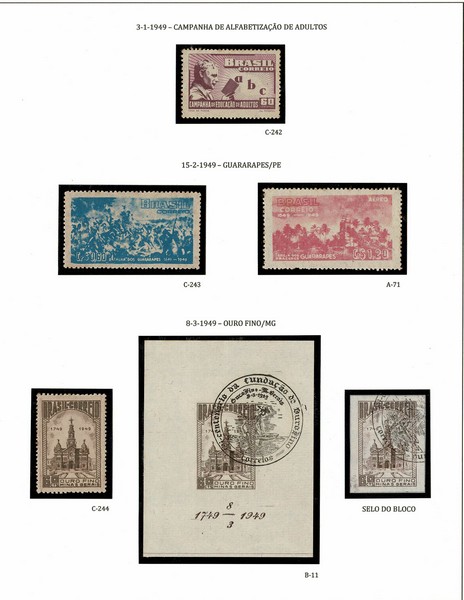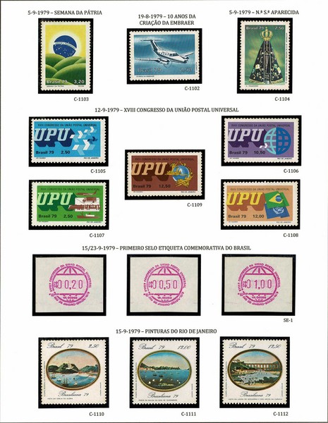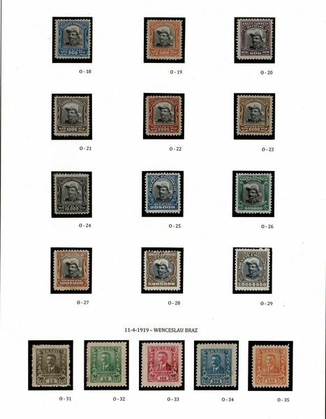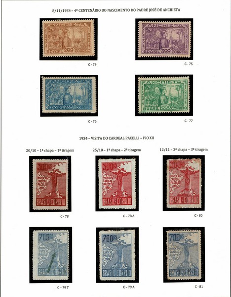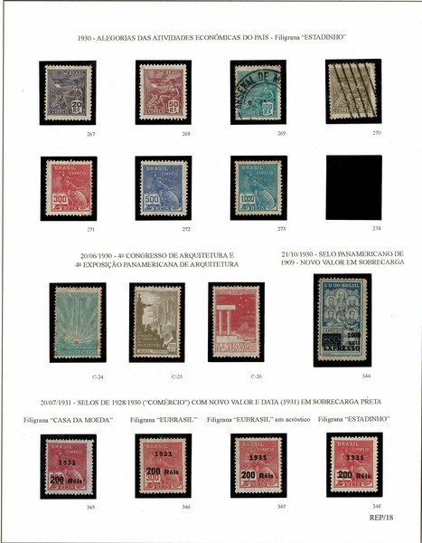 GRANDIOSA COLEÇÃO ENTRE ANOS 1889 e 2008 – Coleção extremamente completa nos períodos mencionados, englobando os seguintes setores: Regulares (todos os períodos, começando na emissão Cruzeiro) Comemorativos (desde a 1ª série) Aéreos (completo nos selos tipo, desde a 1ª série) Blocos (completo, desde o começo, incluíndo todos os selos de Blocos, inclusive dos não picotados, como Dutra, Ouro Fino e Roosevelt – só neste setor, acima de 4.000 UF) Além destes setores, temos o setor dos Oficiais completo sem carimbo (+ de 2.500 UF só neles) Diversas cadernetas, incluindo as boas 5/7 com certificado de expertização(4.000 UF só neste setor) Muito bem abastecido no setor dos Automatos, basicamente só faltando a boa série 12/16, com 3x o nº SE1 em diferentes faciais, SE4/5 em pares vertical sem facial e com certificado de expertização. No setor dos regulares, faltam só as “super peças” como # 243, 274, 293, 402/404 e outros. Tem todo o restante, predominando os sem carimbo. O nº 477 está usado e com certificado de expertização. Também temos diversas variações da séries das frutas, com diferenças no papel traseiro de fixação/impressão. No setor dos comemorativos, ele está basicamente completo nos selos tipo (não tem as filigranas menores e/ou diferentes) mas em compensação tem o setor dos Pacelli completo, incluíndo o bom triângulo (2.200 UF) só ele + folha da transamazônica + diversas opções de se-tenants desde a década de 70 etc. Só de REAL temos cerca de 15 anos (com rarissimas lacunas, mas de selos bem baratos) em todos os setores. Toda a coleção está montada em 12 super bem conservados ALBUNS importados do fabricante Alemão Lindner, com o devido estojo e todos nas cor marrom claro (custo na Alemanha de cada album deste novo é de 77 Euros !! + impostos + frete) fora as centenas de folhas montadas com o devido plástico rígido protetor. Ela também está toda em protetores importados ! e extremamente limpa de um modo geral. No começo da República predominam os selos usados, bem como em alguns regulares, mas basicamente de 1940 para cá, toda sem carimbo (salvo um ou outro caso pontual) A coleção tem ao todo 7 certificados de expertização Peter Meyer, que já tem um custo de R$ 1.400 + as 12 Capas com estojo, folhas etc. Até para o revendedor, o preço inicial pedido é extremamente vantajoso. Ilustramos 8 folhas, para o potencial interessado ter uma ideia da montagem
