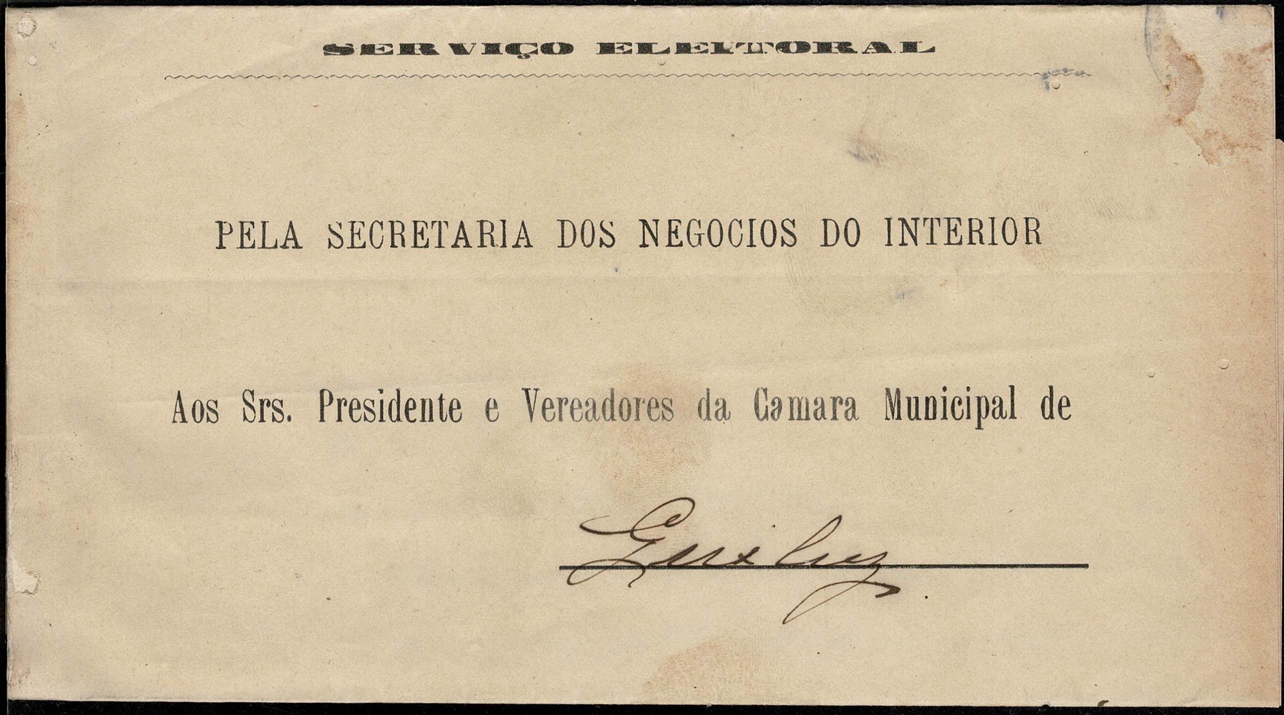 ANO 1909 – SERVIÇO ELEITORAL – Impresso dobrado enviado pela Secretaria dos Negócios do Interior, de São Paulo, para a Camara de Vereadores da cidade de Queluz (SP) Texto alusivo à eleição de Senador Estadual. Selo caído ou arrancado. Alguns pequeninos furos de inseto