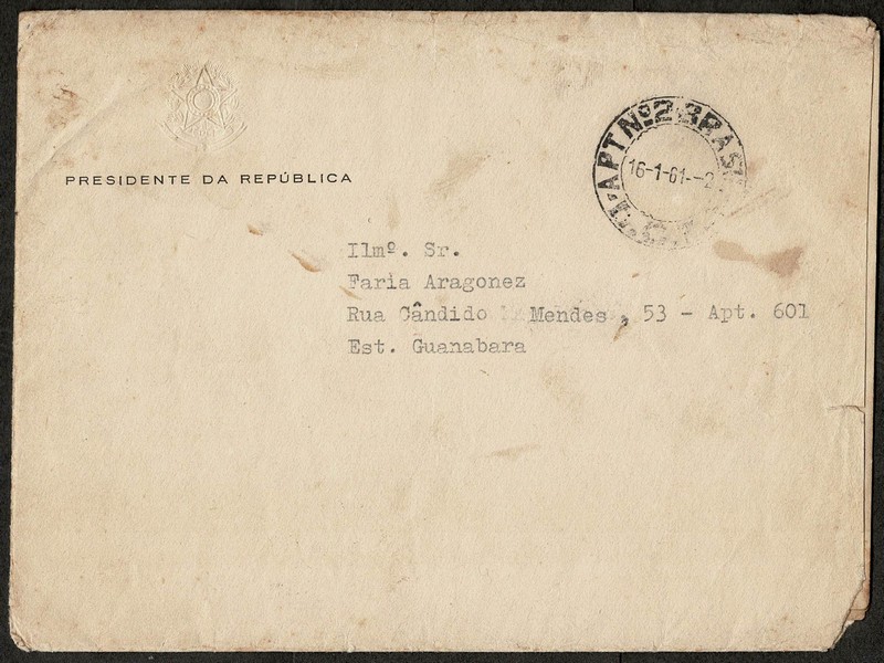 Ano 1961 – JUSCELINO KUBITSCHEK – Envelope timbrado do Presidente da República, circulado de Brasilia para o Rio de Janeiro, com isenção postal, tendo no seu interior, carta de agradecimento impressa e assinatura também impressa do presidente. Carimbo 16.01.1961. Algum senão na abertura