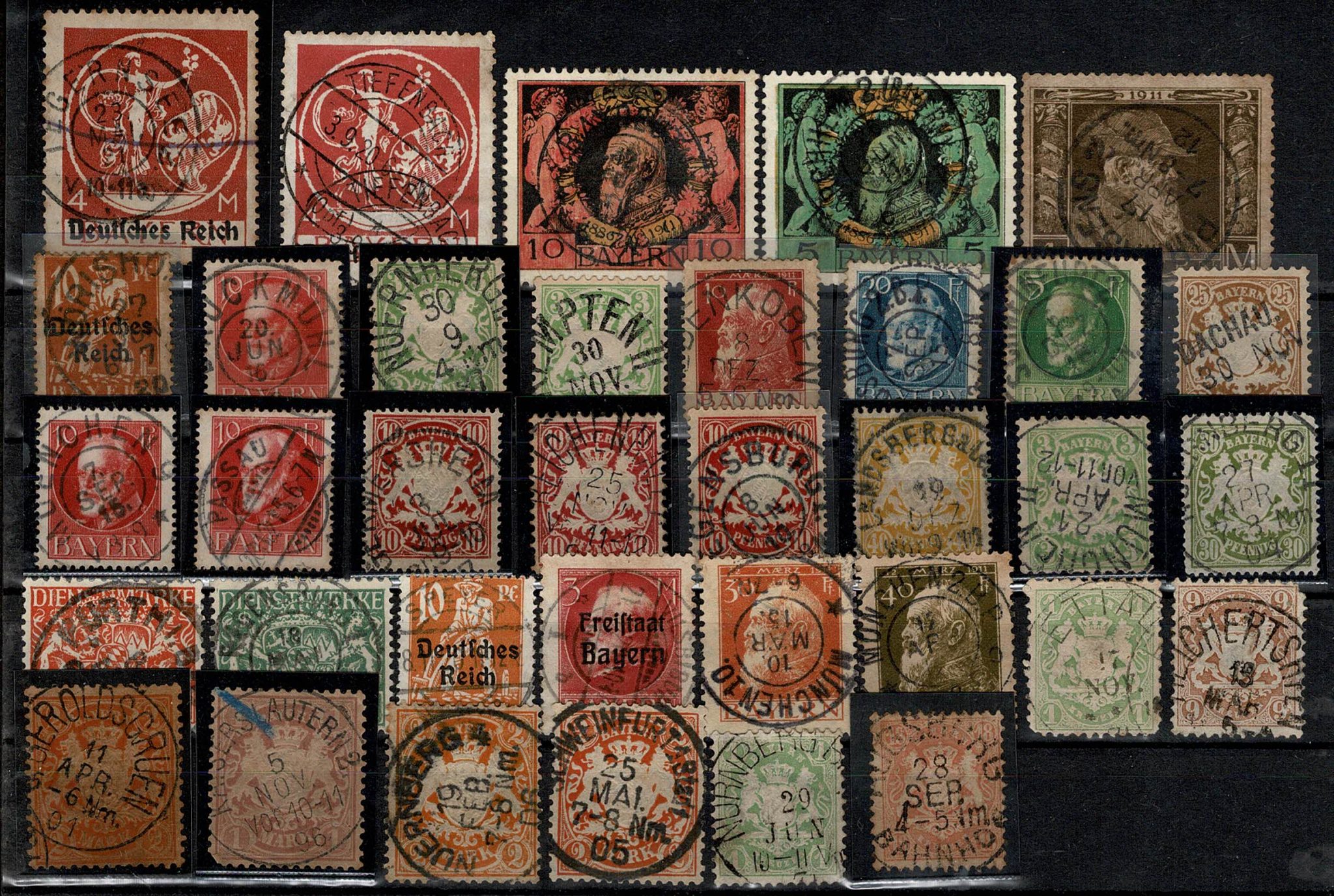 ◉ BAVIERA – CARIMBOLOGIA – Cartela com 35 carimbos, quase todos circulares. Começa no século 19. Um ou outro pode ter algum senão…..