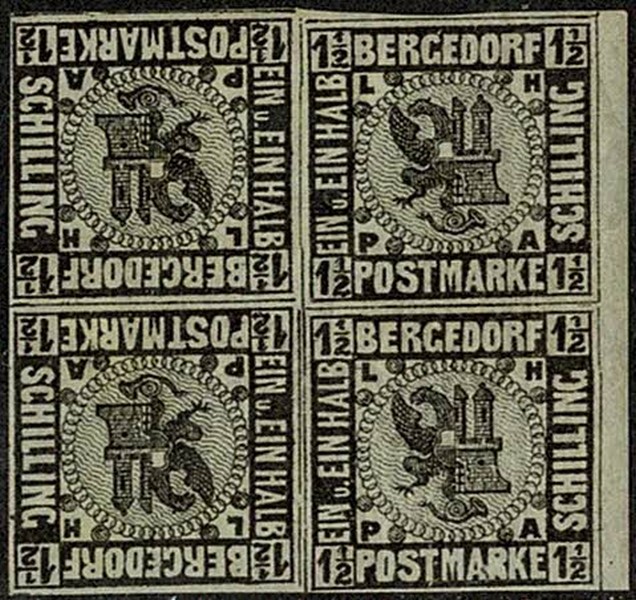 BERGEDORF */** 3K – Quadra formado 2 tete beches !! na horizontal. Par superior só com marca de charneira e par inferior **. Expertizado Dr Oertel. Material oriundo da Europa.