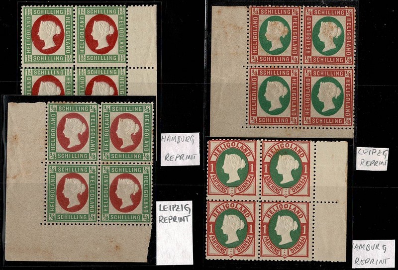 **/* HELIGOLAND – 4 diferentes QUADRAS margem ou canto de folha. Todos reimpressões de Leipzig e Hamburgo – 2 de cada…