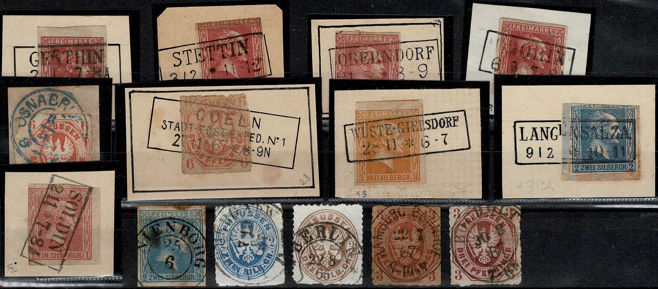 ◉ PRÚSSIA – CARIMBOLOGIA – Cartela com 14 carimbos diversos. Parte montados em suportes. Não verificado quanto à qualidade…