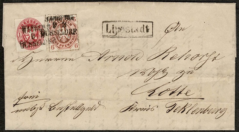 Prússia – Ano 1863 – Sobrecarta completa circulada internamente ? com chegada. Selos Michel 15 e 16 com carimbo em 3 linhas: Warburg-Düsseldorf Lippstadt tipo linear com cercadura. Peça bem limpa, mas com marca de vinco horizontal não atingindo os selos.