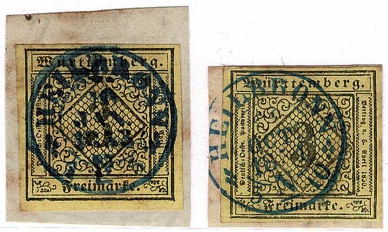 ◉ Wurttemberg – 2 – Dois selos com carimbo 100%, em azul: Heilbronn. Ambos sobre fragmento.