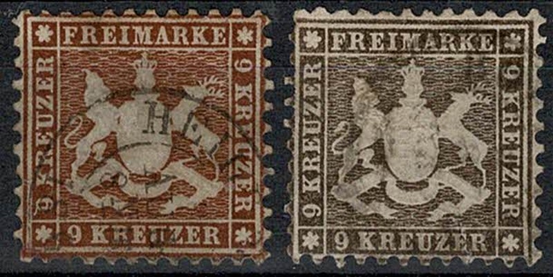 ◉ Wurttemberg – 28 – 2 selos em nítida diferença de cor – 285 Euros pela cor barata.
