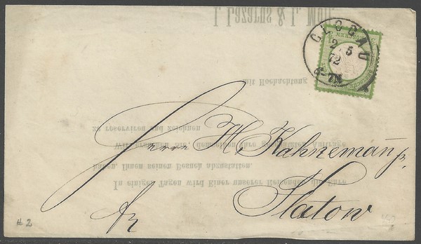 ** História Postal – Ano 1872 – Impresso com selo Michel 2, circulado de Glogau para Flatow ? com possivel chegada. 300 Euros pela cor barata.