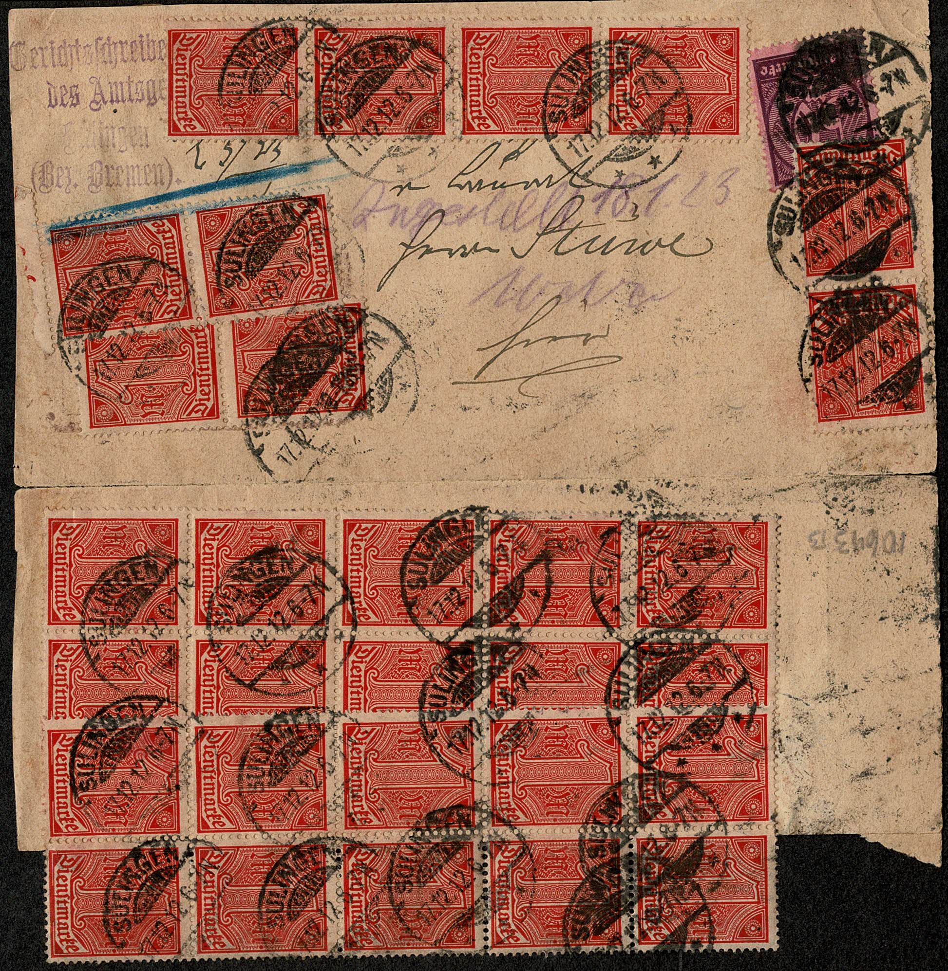 Ano 1912 – Possível 2 partes de envelope/frente de pacote ?/cinta ? porteado com 30 selos de serviço Michel 30 1 x nº 29. Curioso que a data é 17.12.12, quando o selo foi emitido em 1920. Tem uma indicação manuscrita de recebimento no dia 10.1.23, então o ano correto seria 1922…