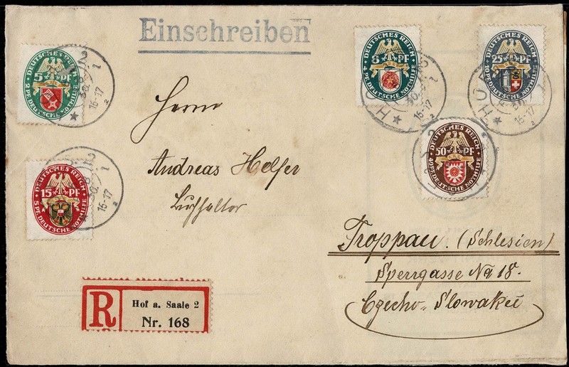 ** História Postal – Ano 1930 – Envelope registrado circulado internamente, mas sem chegada. Série completa Michel 430/434 (Escudos) Poucos pontos de ferrugem.