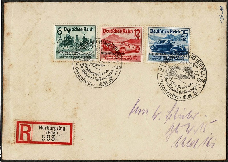 ** História Postal – Ano 1939 – Envelope registrado circulado internamente com chegada. Série completa Michel 695/697, com carimbo comemorativo, mas não alusivo. Pontos de ferrugem – 145 Euros.