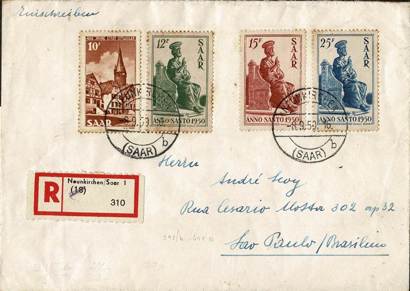 SARRE – Ano 1950 – Envelope registrado circulado para São Paulo. Selos Michel 293/296 que usados cotam 60 Euros. Pontos de ferrugem acentuados.