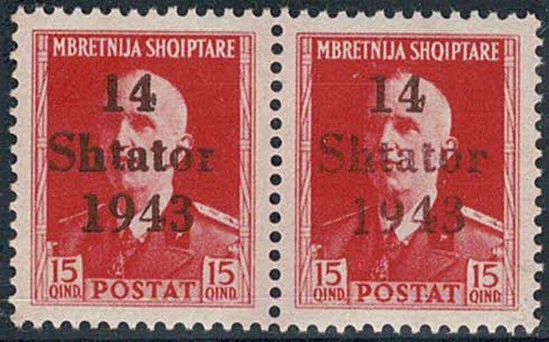 ** ALBANIA – Especial 6 VII (9 de 1943 aberto em cima) Par horizontal, ficando o selo da direita com a variedade – 60 Euros
