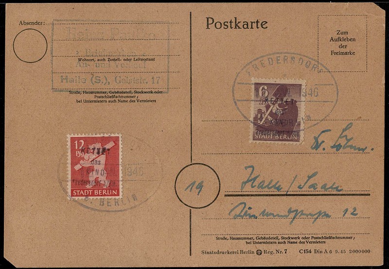 FREDERSDORF – Ano 1946 – Cartão circulado ? internamente com série completa Michel 69/70 com data 02.01.1946 – Eles tinham validade entre 14/12/45 e 10/01/46 (menos de 1 mês) 2 cantos arredondados na peça..
