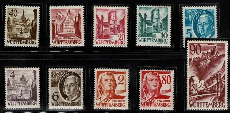 * Francesa – WURTTEMBERG – Michel 28/37 – Série completa limpa, só com marca de charneira e sem ferrugem – 90 Euros..