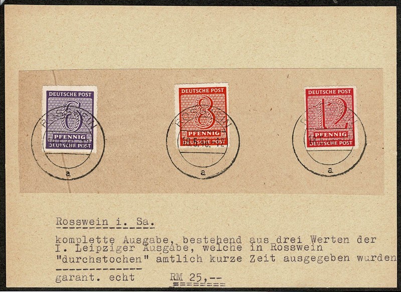 Zona Soviética ◉ 117/119D Especial – Emissão de Rosswein, os 3 valores sobre fragmento e carimbo da própria localidade de 18.5.46 – Qualidade alemã – 210 Euros.