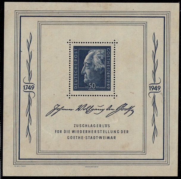 Zona Soviética * Bloco 6 (Goethe) Só o selo gomado (como emitido) Alguns pontos de ferrugem – 150 Euros.