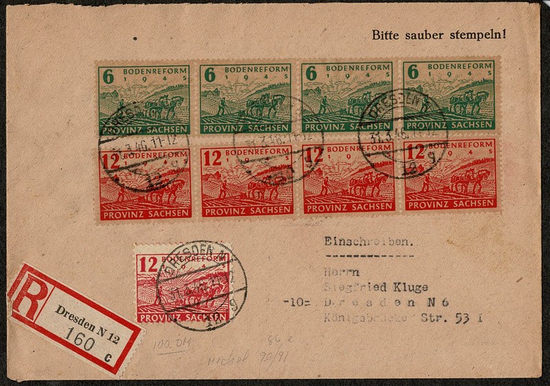 Soviética – Ano 1946 – Envelope registrado circulado internamente com chegada. Selos Michel 86 (isolado) e série 90/91 em tiras de 4 horizontal. Valor dos selos usados: 98 Euros. Ótima qualidade.