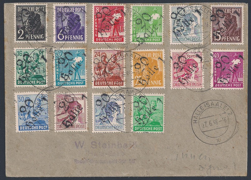BEZIRK – 166/181(sem nº 179) – Sobre envelope, cidade de Halle. Carimbo : 27.6.48 – Todos Expertizados – 250 Euros para a série usada isolada