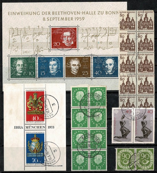 ◉ Caixa com cerca de 3.000 selos, predominando os regulares entre décadas de 50 e 80. No meio, 2 blocos, incluso o nº 1