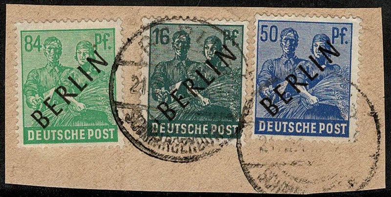 ◉ 7 + 13 + 16, sobre fragmento, com carimbo de Berlin (pouco legível) – 172 Euros.