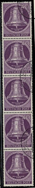 ◉ 105 – Sino, badalo no meio – Tira de 5 vertical, com carimbo circular – 250 Euros .