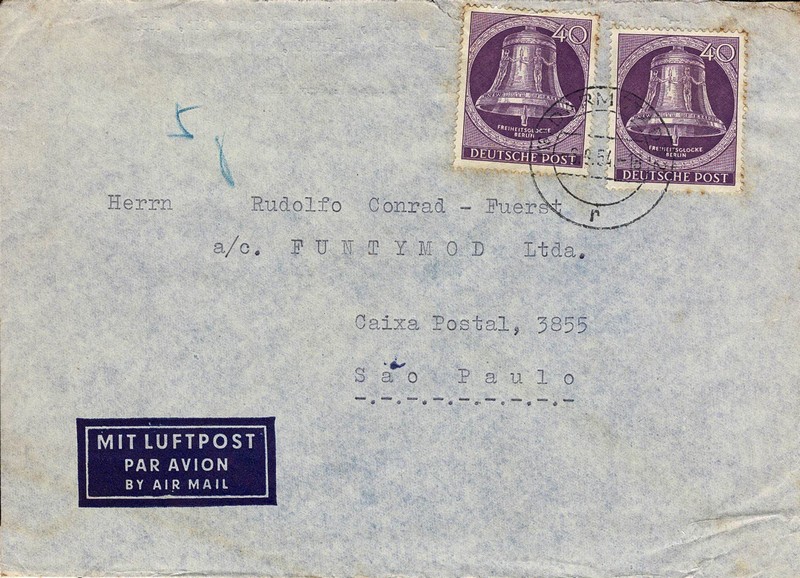 Ano 1954 – Envelope circulado de Darmstadt para São Paulo. 2 selos Michel 105. Peça com restrição na parte superior pontos de ferrugem. 290 Euros