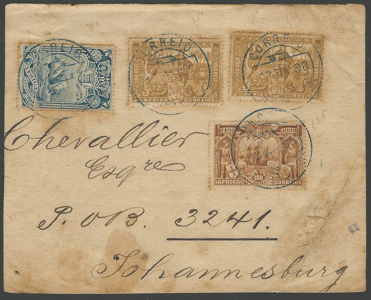 AFRICA PORTUGUESA – Ano 1898 – Frente de envelope circulado para a Africa do Sul. Selos Yvert: 5, 7 e 8×2. Pontos de ferrugem…