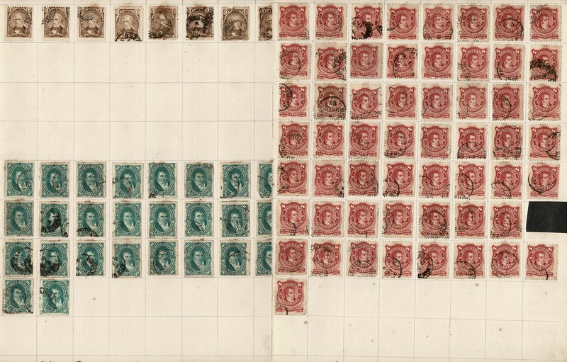 ARGENTINA ◉ CLÁSSICOS – SÓ SÉCULO 19 – Antigas folhas de caderno artesanal, contendo 125 selos, de 6 tipos DIFERENTES. Todos “colados” nas folhas. Será que saem na água ? Vendidos com esta ressalva
