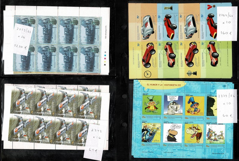 ARGENTINA ** ESTOQUE SÉRIES/SELOS COMPLETAS(OS) – Estoque entre anos 1997/2006. A quantia é de 2 maneiras: 10x ou 16x de cada. Muitos temáticos. Yvert # 1964 x 16, 2143/50 x 10, 2197/2202 x 10, 2242 x 16, 2264/67 x 10, 2342 x 16, 2347/50 x 16, 2351/52 x 16, 2364/65 x 16, 2379/86 x 10, 2422/23 x 16, 2424/27 x 16, 2559/62 x 16 e 2610/13 x 10. Tudo absolutamente **. No total temos 960 Euros. Aqui pedimos apenas 0,50 centavos !! de real o Euro, que dá enorme vantagem numa eventual revenda