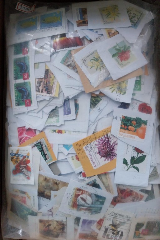 AUSTRALIA ◉ SOBRE FRAGMENTO – Caixa com 6.000 selos sobre fragmento, comemorativos e Regulares.