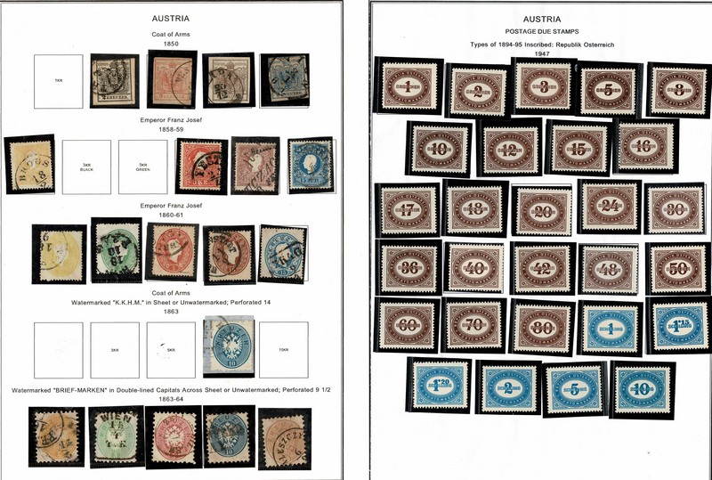 AUSTRIA – Anos 1850 a 1947 – COLEÇÃO dentro de 2 pastas tipo catálogo, contendo 720 selos DIFERENTES com e sem carimbo. Incluso itens melhores, como Yvert 2, 11, 17/21 e 45 – todos usados e com 365 Euros só neles. Incluso as emissões do Correio de Campanha, Ocupações, Lombardia e Levante. Todos afixados com protetores em folhas de album tiradas pela internet e baseadas no catálogo Scott.